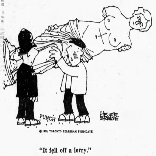 A variant is to fall off a lorry; on Thursday 13th August 1970, the St. Petersburg Times (St. Petersburg, Florida) reprinted the following cartoon from Punch, the London satire magazine; a man carrying an antique statue over his shoulder declares to a bobby: