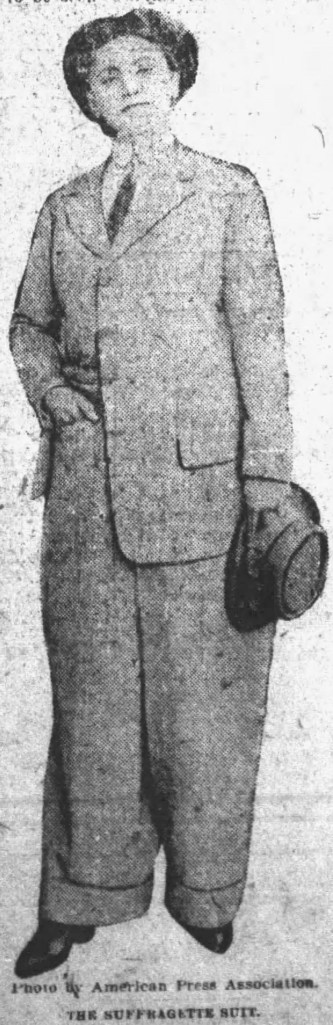 New York tailors put their heads together recently and evolved the suit pictured, which they have named the suffragette costume. But it remains to be seen whether there is a suffragette sufficiently advanced to appear in this reproduction of father’s togs.