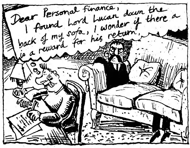 The following letter and illustration are from Money writes, published in The Observer (London, England) of Sunday 9th July 1995—the British peer Lord Lucan (Richard John Bingham – born 1934) disappeared in 1974 after being suspected of murder:
