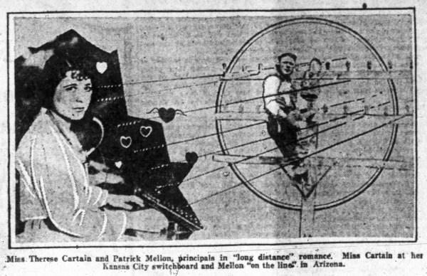 Miss Therese Cartain and Patrick Mellon, principals in “long distance” romance. Miss Cartain at her Kansas City switchboard and Mellon “on the line” in Arizona.
