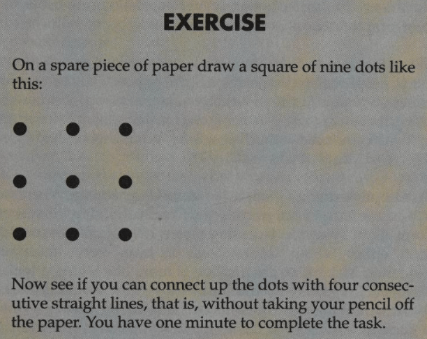 The dots and the box are related. A brain teaser used in 1984 by Development Dimensions International, management consultants, showed eight dots forming a square, or box, with a dot in the middle. “Without lifting your pencil from the paper,” the teaser went, “join all the dots with only four straight lines.” It looks like this: