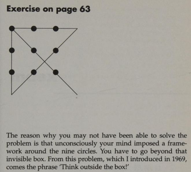 The reason why you may not have been able to solve the problem is that unconsciously your mind imposed a framework around the nine circles. You have to go beyond that invisible box. From this problem, which I introduced in 1969, comes the phrase “Think outside the box!”