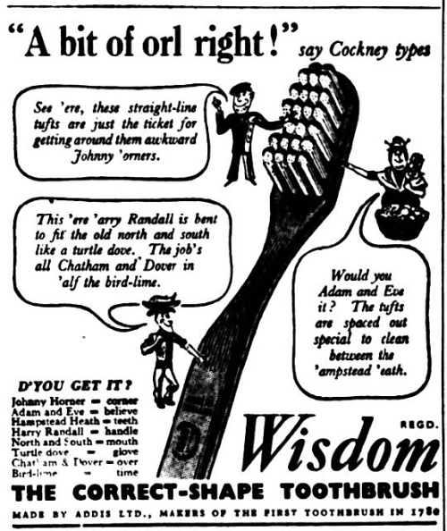 2-: This advertisement for Wisdom, “the correct-shape toothbrush”, published in the Birmingham Gazette (Birmingham, Warwickshire, England) of Wednesday 29th October 1947: