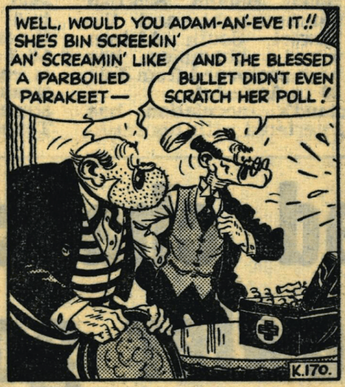 WELL, WOULD YOU ADAM-AN’-EVE IT!! SHE’S BIN SCREEKIN’ AN’ SCREAMIN’ LIKE A PARBOILED PARAKEET—