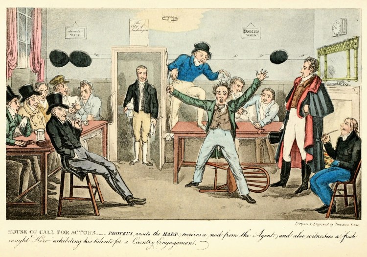 Fortunately for Proteus the first visit he paid to the above resort of performers was during Passion Week. It is a short period of relaxation for the profession; and the house generally overflows during the week with talents of every description. […] Country managers, by dozens, may be witnessed on the “look out” for recruits; and itinerant actors, equally anxious and on the alert to procure new engagements, likewise repair to the metropolis, and direct their attention towards the Harp.