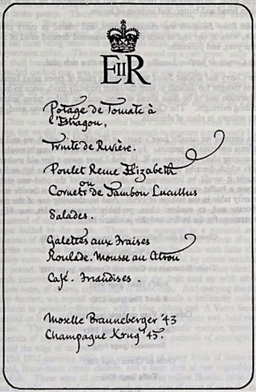 This dish is so named because it was originally created for a lunch held to mark the coronation of Queen Elizabeth II, on Tuesday 2nd June 1953, at which it was called Poulet Reine Elizabeth.