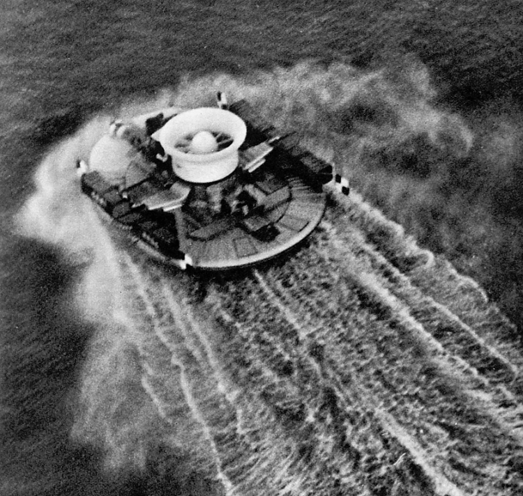 For some years Mr. Cockerell has worked on similar lines to other inventors in Britain and America to evolve a method of providing a “cushion” of air beneath an object which would suspend it and allow it to be moved without the friction of wheels running on road or rails or the friction of water on the hull of a ship.