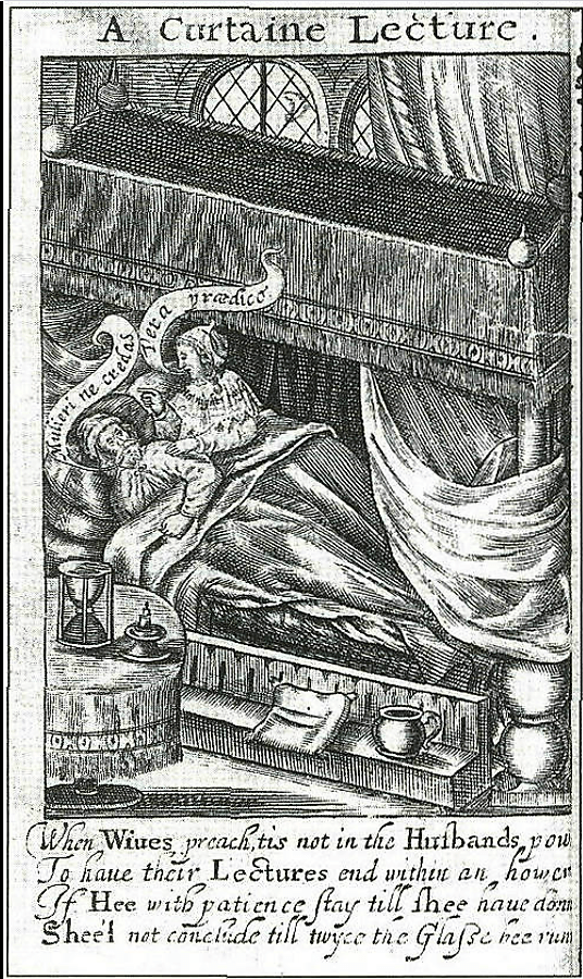 This is the frontispiece to A Curtaine Lecture (London: Printed by Robert Young for John Aston, 1637), by Thomas Heywood—the husband says Mulieri ne credas (i.e., Do not believe women), and the wife says Vera prædico (i.e., I assert the truth):