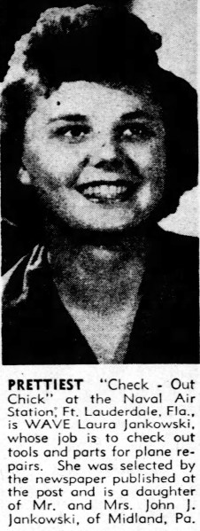 PRETTIEST “Check-Out Chick” at the Naval Air Station, Ft. Lauderdale, Fla., is WAVE Laura Jankowski, whose job is to check out tools and parts for plane repairs. She was selected by the newspaper published at the post and is a daughter of Mr. and Mrs. John J. Jankowski, of Midland, Pa.