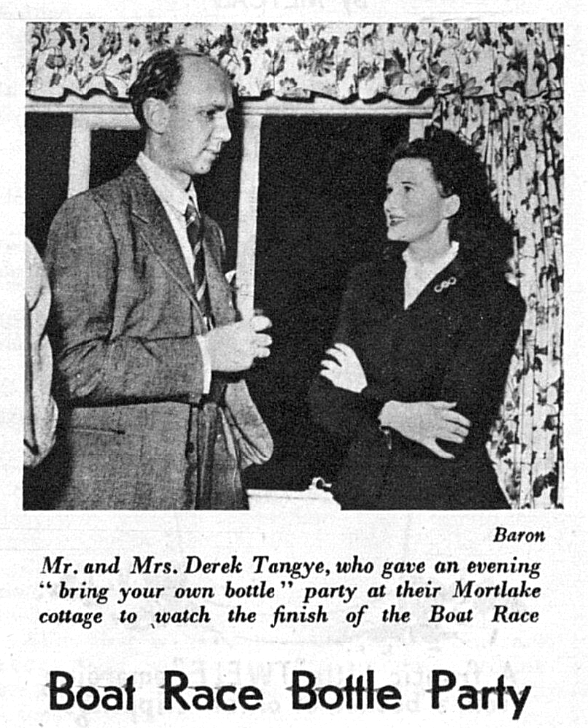 Mr. and Mrs. Derek Tangye, who gave an evening “bring your own bottle” party at their Mortlake cottage to watch the finish of the Boat Race