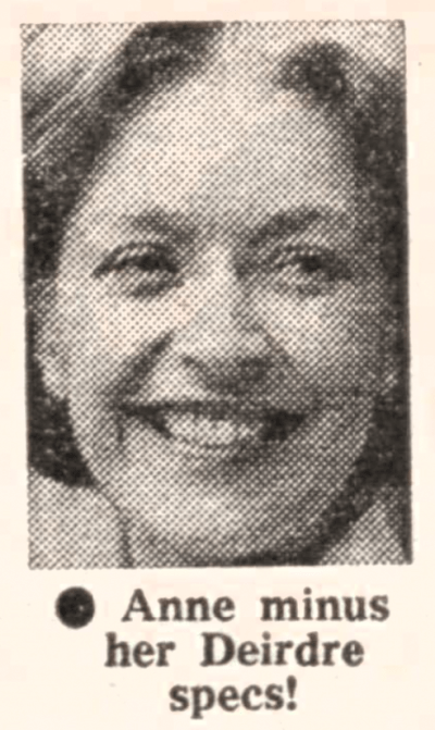 For example, the following—with a photograph of Anne Kirkbride as Deirdre Barlow—is from We find out which glasses have… specs appeal, by Lynn Barlow, published in the Evening Post (Bristol, England) of Tuesday 30th July 1991 [No. 17,990, page 10, column 2]: