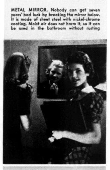 METAL MIRROR. Nobody can get seven years’ bad luck by breaking the mirror below. It is made of sheet steel with nickel-chrome coating. Moist air does not harm it, so it can be used in the bathroom without rusting