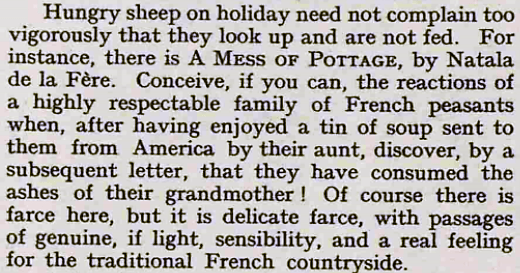 Read MoreHungry sheep on holiday need not complain too vigorously that they look up and are not fed. For instance, there is A Mess of Pottage, by Natala de la Fère. Conceive, if you can, the reactions of a highly respectable family of French peasants when, after having enjoyed a tin of soup sent to them […]