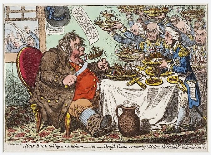 Read MoreJohn Bull taking a Luncheon:—or—British Cooks, cramming Old Grumble-Gizzard, with Bonne-Chère. hand-coloured etching by James Gillray, published on 24th October 1798 — © Trustees of the British Museum This print was published just after Nelson’s victory at the Battle of the Nile. He is shown in the forefront of British admirals and naval heroes, serving up […]
