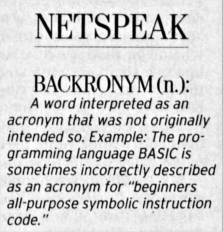 USA, 1983—an acronym deliberately formed from a phrase whose initial letters spell out a particular word or words, either to enhance memorability or as a fanciful explanation of a word’s origin—blend of the adjective ‘back’ and of the noun ‘acronym’